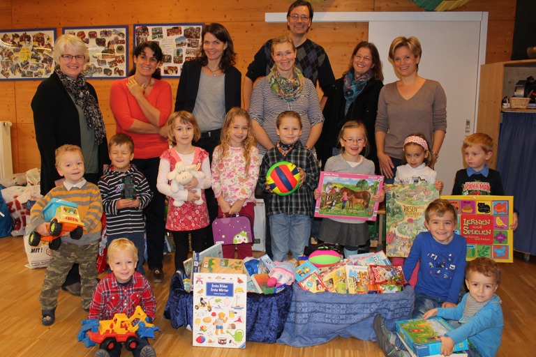 Spendenübergabe im Kindergarten Maria Rast mit einigen Kindern und einem Teil der gespendeten Spielsachen: Kindergartenleiterin Angela Bauer (hinten, von links), Arbeitskreis-Leiterin Sabine Rieger und Caritas-Mitarbeiterin Anna Helmke sowie die Elternbeiräte Marion Buchner, Matthias Schäfer, Sabine Krumböck und Simone Brinkmann.