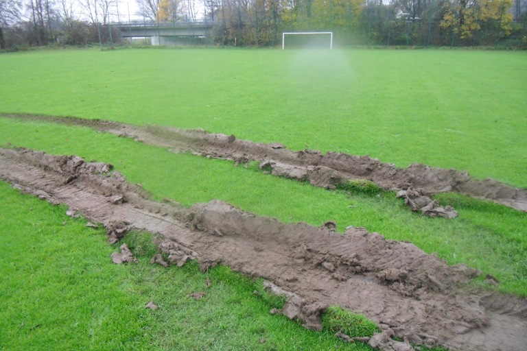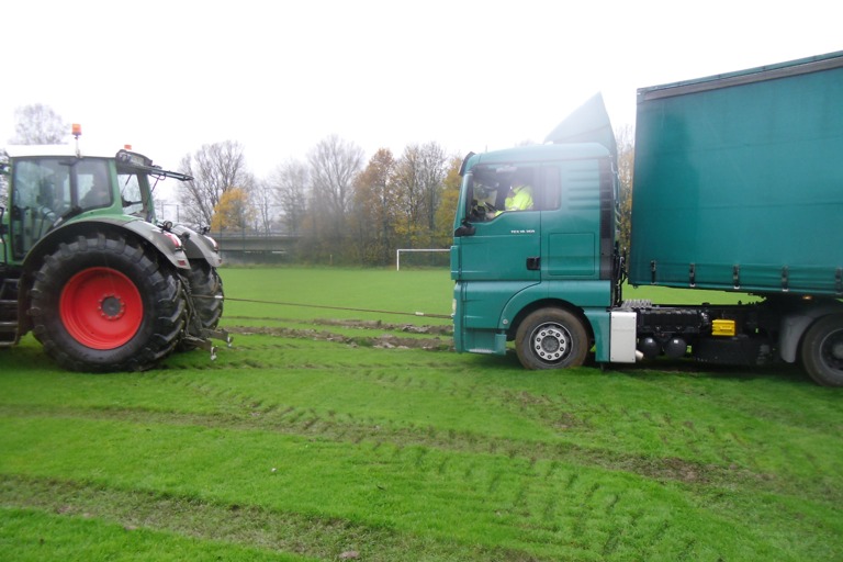 Im Herbst ist der Fußball-Rasen eben tief, darunter leiden nicht nur die Kicker, deren Beine schon Mitte der zweiten Halbzeit schwer werden. Dumm gelaufen jedenfalls für den Fahrer des Sattelzugs, der Hilfe brauchte, um sein Gefährt wieder auf die Straße zu bekommen – und Glück für die Stadt. Denn weil der Lkw sich festgefahren hatte und nicht mehr weiterkam, konnte er sich eben auch nicht aus dem Staub machen nach seiner PS-starken Blutgrätsche für den grünen Teppich. Der Übeltäter ist also bekannt. Und dürfte nun wohl seinem Chef bald erklären müssen, was es mit der Rechnung auf sich hat, die der Spedition für den angerichteten Schaden ins Haus flattert.