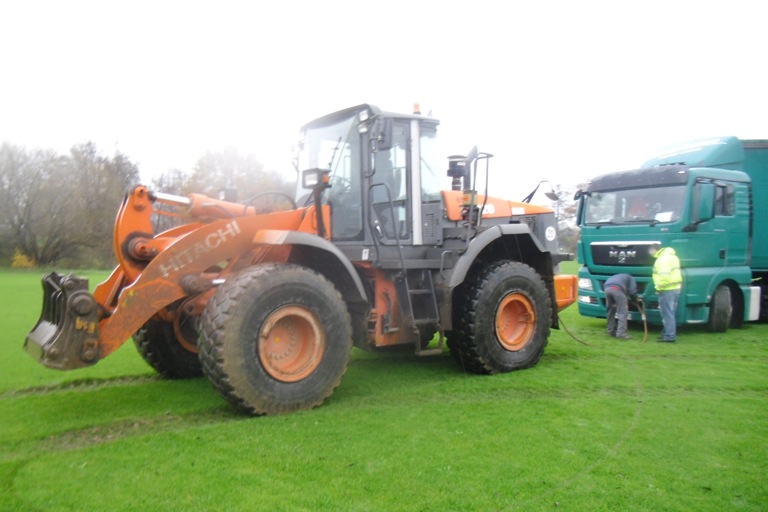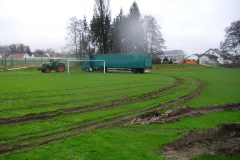 (ty/zel) Ein Sattelzug auf Abwegen hat diese Woche den Fußballplatz im Pfaffenhofener Ortsteil Förnbach mal so richtig umgepflügt. Der Fall wurde heute von Bürgermeister Thomas Herker (SPD) über das soziale Netzwerk Facebook öffentlich gemacht. Demnach war der Lenker des Gespanns in eine Straße mit Tonnagebeschränkung gefahren, wollte dann komfortabel umdrehen und hat dabei den halben Platz umkreist, ehe er letztlich steckenblieb. Ohne fremde Hilfe ging jetzt nichts mehr, wie auch die Fotos belegen, die die Stadtwerke zur Dokumentation des Malheurs geschossen haben. Mit schwerem Gerät musste man dem Lkw Hilfestellung leisten.