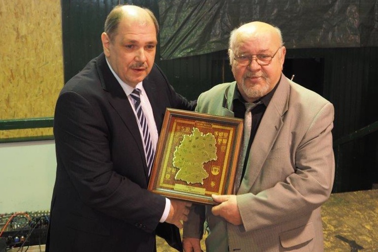 Der Präsident des Verbands der Deutschen Brieftaubenzüchter, Richard Groß (links), übergibt einen aufwändig gestalteten Ehrenpreis als Jubiläumsgeschenk an den Vorsitzenden der Reisevereinigung Hallertau, Ernst Arnold.