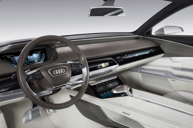 Der geräumige Innenraum des Audi prologue wirkt wie eine luxuriöse Lounge. Er orientiert sich am Gran Turismo und ermöglicht sowohl sehr sportliches Fahren als auch entspanntes Reisen. Das Interface passt sich dem jeweiligen Fahrstil optisch an. Der Innenraum steht für den Beginn einer neuen Ära bei Audi, in der die Architektur mit dem Bedienkonzept zu einer Einheit verschmilzt. Die Flächen für Anzeige und Bedienung sind auf innovative Weise in die Instrumententafel und die Konsole des Mitteltunnels integriert, das Infotainment bringt Fahrer und Beifahrer in einen Dialog miteinander.