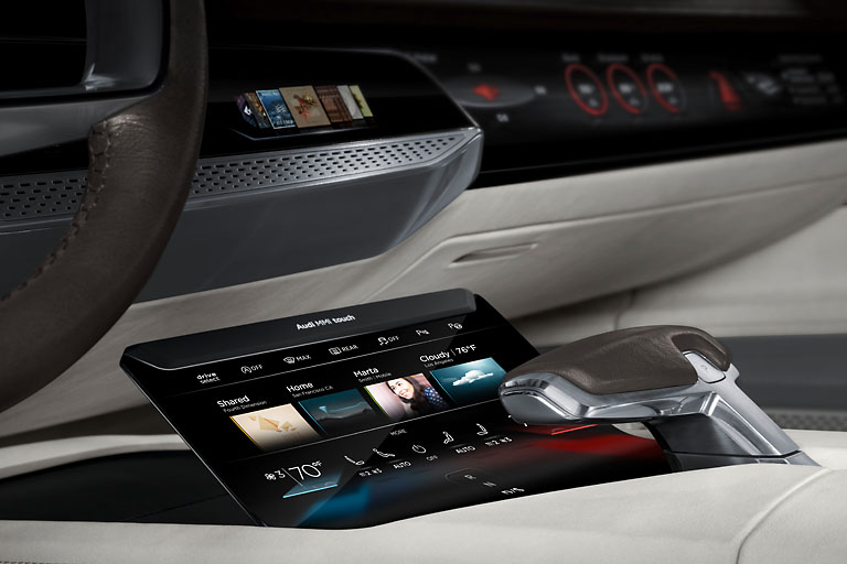 Schon beim Einsteigen empfängt das viersitzige Coupé seine Passagiere mit dezenter Höflichkeit. Der „Butler“, eine innovative intelligente Software, identifiziert sie anhand ihrer Smartphones und stellt die Sitze und die Klimaanlage nach ihren Vorlieben ein. Auch bei der Musik und der Routenplanung macht das System Vorschläge, die sich an den Präferenzen des Besitzers orientieren. Das Easy Slot System, eine Weiterentwicklung der Audi phone box, befindet sich unter Klappen in der Mittelkonsole. Ein spezieller Mechanismus vernetzt die Smartphones der Passagiere mit dem Bord-Infotainment und lädt sie auf.