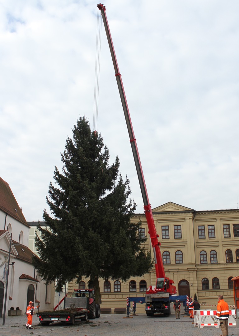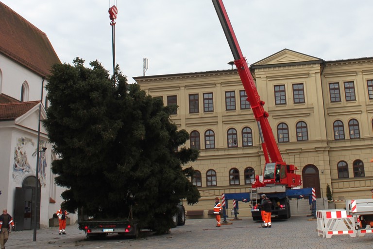 (ty) Vorweihnachtliche Stimmung macht sich breit in der Pfaffenhofener Innenstadt. Nachdem die Weihnachtshütten vor dem Rathaus schon für den Christkindlmarkt aufgebaut sind und auch die Straßenbeleuchtung aufgehängt wurde, steht jetzt auch der Christbaum am oberen Hauptplatz. Die Bauhofmitarbeiter stellten den Weihnachtsbaum gestern, kurz vor Beginn der Adventszeit, auf dem Platz vor dem Haus der Begegnung auf. Der große Autokran, den die Firma Fasold aus Waidhofen der Stadt Pfaffenhofen kostenlos zur Verfügung stellte, war dabei ein große Hilfe.