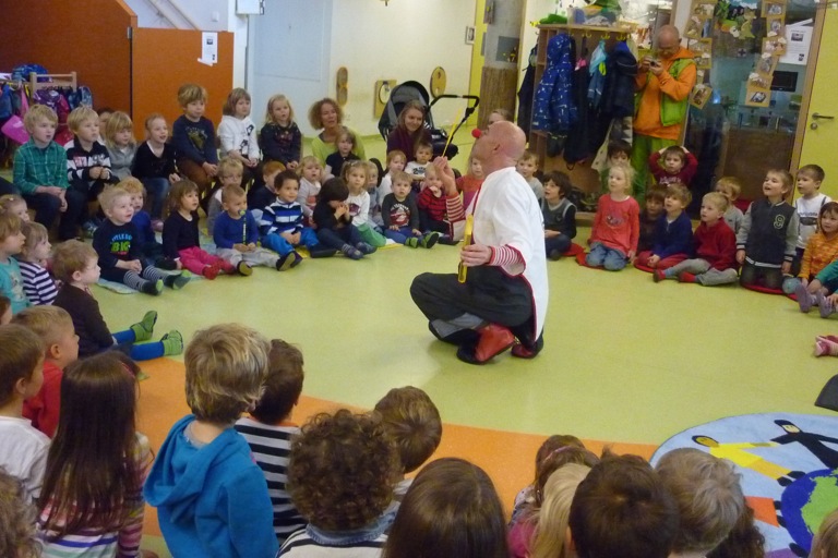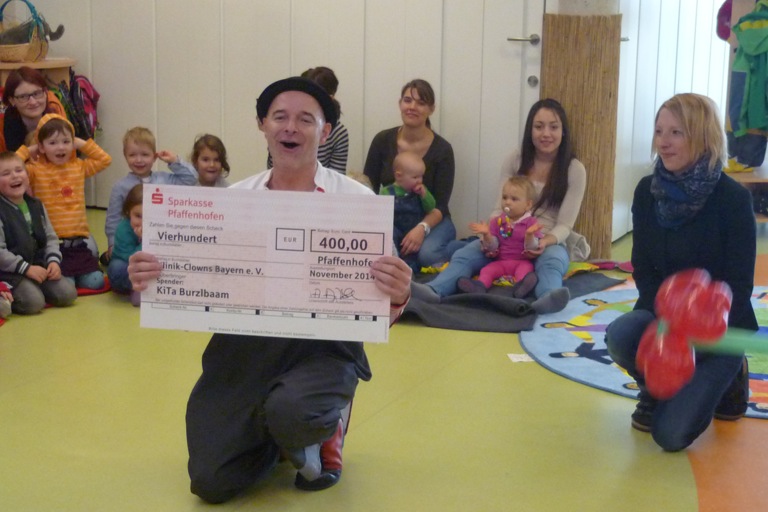 Die Burzlbaam-Kinder hatten riesen Spaß, als Lupino einen echten Burzlbaam machte oder Seifenblasen fing. Als Dankeschön für den Scheck über 400 Euro zeigte der Klinik-Clown noch seine Künste beim Luftballon-Modellieren und formte eine große Blume. Dieser Vormittag wird noch lange nachwirken, und zwar bei den kleinen Zuschauern ebenso wie bei den großen. Der Auftritt rührte vor allem die Erwachsenen sehr und Kita-Leiterin Andrea Mischke betonte: „Es war heute eine der berührendsten Begegnungen, die man sich vorstellen kann. Die Klinik-Clowns schenken so vielen Menschen ein Lächeln, um deren Schicksal ein wenig erträglicher zu machen. Die Spende geben wir von Herzen und wir wissen, das dies mehr als gut investiert ist.“