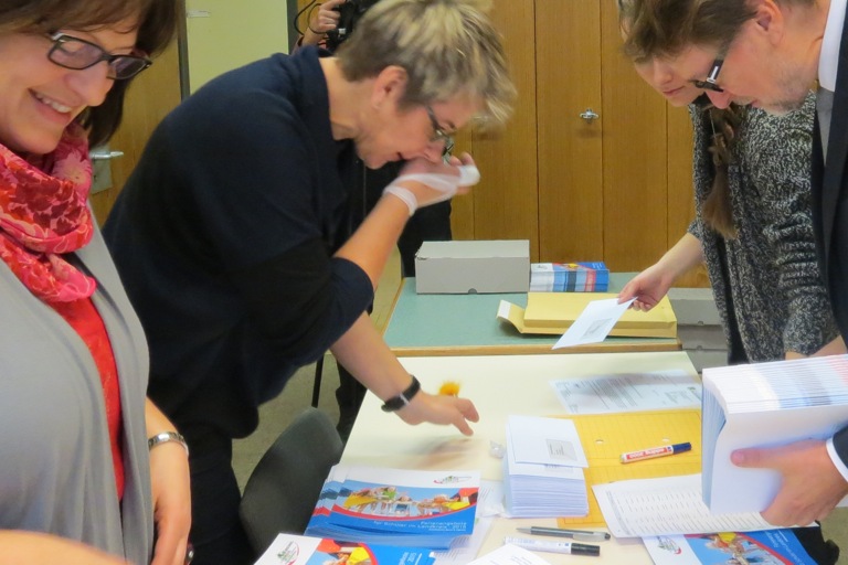 Sonja Gaul (von links), Leiterin des Projekts Ferienangebote, Frauke Mock, Leiterin der Arbeitsgruppe Beruf und Familie, und Landrat Martin Wolf verpacken die Broschüren, die noch vor den Weihnachtsferien an die Eltern verteilt wird.