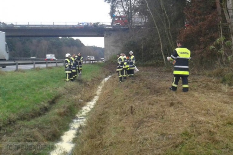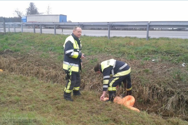 (ty) Die Feuerwehr Reichertshofen wurde gestern Nachmittag auf die Verbindungsstraße zwischen Baar und Forstwiesen, Höhe Autobahnbrücke A9, alarmiert. Dort war nach Angaben eines Feuerwehrsprechers ausgelaufener Dieselkraftstoff in einem Entwässerungsgraben festgestellt worden. Verursacht wurde dieser Zwischenfall vermutlich durch einen Lkw-Unfall, der sich in den Morgenstunden dort ereignet hatte. Der Kraftstoff wurde von den Wehrmännern mit Hilfe eines speziellen Ölbindemittels gebunden und konnte dann aufgenommen werden. „Das kontaminierte Erdreich wird durch eine Spezialfirma abgetragen und entsorgt“, wird weiter berichtet. Die Autobahnmeisterei und die Polizei waren ebenfalls Ort.