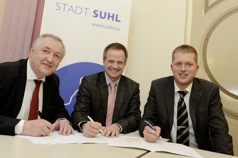 Dagobert Achatz (von links), Geschäftsführer der Audi‑Umweltstiftung, Jens Triebel, Oberbürgermeister der Stadt Suhl, und Ralf Belgardt, Geschäftsführer der Stadtwerke Suhl/Zella‑Mehlis Netz GmbH, unterzeichnen den Vertrag für das Artenschutzprojekt „Leuchttürme der Biodiversität“.