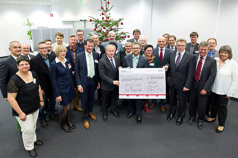 Die traditionelle Weihnachtsspende veranstaltet der Audi Betriebsrat seit 37 Jahren. Insgesamt kamen in diesem Zeitraum mehr als 15 Millionen Euro für den guten Zweck zusammen. Den Spendenbetrag von rund 470 000 Euro der Audi-Belegschaft stockte das Unternehmen in diesem Jahr mit einer Summe von knapp 180 000 Euro auf.