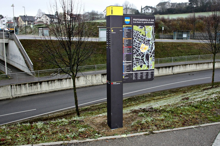 Letztlich entschied man sich für ein zweiteiliges System in der Farbe umbragrau, das eigens für die Stadt Pfaffenhofen entworfen und hergestellt wurde: Bei dem Grundelement der Fußgänger-Wegweisung handelt es sich um eine vierseitig beschriftete Stele mit einer Höhe von 2,25 Metern und einer Seitenlänge von 23 Zentimetern, um ein schlankes Erscheinungsbild zu gewährleisten. Die Beschriftung sei mit Digitaldruck auf einer Graffiti-Schutzfolie vollflächig aufgebracht und könne bei Bedarf ausgetauscht werden. An Knotenpunkten sind die Stelen mit einem „Ausleger“ bestückt, auf dem sich ein Stadtplan befindet.