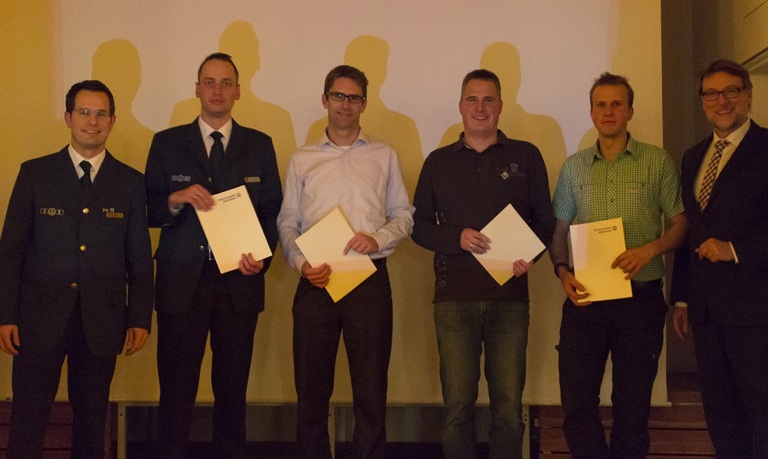 Für 20 Jahre Einsatz im THW wurden Andreas Englbrecht (Dritter von links) und Björn Kelch (Vierter von links) ausgezeichnet. Die Urkunde für zehn Jahre ehrenamtliches Engagement erhielten Michael Matthes (Zweiter von links) und Marcel Jaksch (Fünfter von links) aus den Händen des Ortsbeauftragten Rupert Maier und Landrat Martin Wolf (rechts).