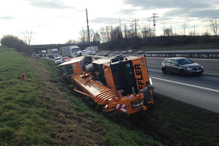 An Fahrzeug und Böschung entstand nach ersten Schätzungen ein Schaden von rund 35 000 Euro. Einen plausiblen Grund für das Abkommen nach rechts konnte der Fahrer nicht nennen. Offenbar fehlte es an der nötigen Aufmerksamkeit. Da die Bergung des Fahrzeuges wesentliche Behinderungen des laufenden Verkehrs mit sich bringt, wird der Autokran erst im Laufe der kommenden Nacht nach dem Berufsverkehr geborgen. Die Unfallstelle wird so lange durch die Autobahnmeisterei abgesichert.