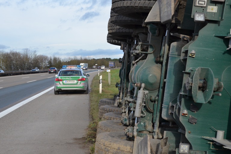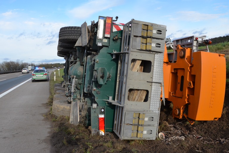 (ty) Heute kurz vor 10 Uhr fuhr – wie bereits kurz berichtet – ein 23-jähriger Kraftfahrer aus dem Landkreis Pfaffenhofen mit einem selbstfahrenden Autokran auf dem rechten Fahrstreifen der Autobahn in Richtung Nürnberg. Etwa drei Kilometer vor der Anschlussstelle Langenbruck kam das 60 Tonnen schwere Fahrzeug nach rechts von der Fahrbahn ab, kippte an der dortigen Böschung auf die rechte Fahrzeugseite und grub sich ins Erdreich ein. Der 23-jährige wurde bei dem Unfall leicht verletzt.