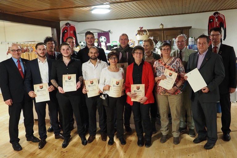 (ind) Im Rahmen der Weihnachtsfeier des BC Uttenhofen wurden etliche Mitglieder für ihre besondere Vereinstreue ausgezeichnet. Der BCU-Vorsitzende Wolfgang Inderwies (stehend von links) freute sich mit Benjamin Mayer (150 Spiele in den Herrenteams), Anton Wagner (BFV-Verbands-Ehrenzeichen in Silber für 30-jährige Mitgliedschaft), Robert Harrer und Roland Heinzinger (beide 150 Spiele), Josef Harrer (200 Spiele), Bastian Weger (150 Spiele), Helga Kaindl, Vereinsarzt Dr. Arvid Thiele, Gertraud Maier, Ruth Thiele, Gertraud Maier (alle bronzene BCU-Ehrennadel für 15-jährige Mitgliedschaft), Hans-Georg Reger (goldene BCU-Ehrennadel für 25-jährige Mitgliedschaft und langjährige Übungsleitertätigkeit sowie BFV-Verbands-Ehrenzeichen in Silber für verdienstvolle Tätigkeit), Ralf Hochmuth (BLSV-Silber) und BCU-Ehrenamtsbeauftragter Michael Thalmeier. Bei der Verleihung der Auszeichnungen konnten nicht anwesend sein: Alois Marb und Renate Traub (beide 15 Jahre Mitglied) sowie Georg Daschner (40 Jahre Mitglied).