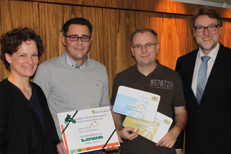 (ty) Das Los hat entschieden und unter den 320 Teilnehmern des Gewinnspiels für Inhaber der Ehrenamtskarte wurde ein Sieger gezogen. Landrat Martin Wolf (rechts), Brigitte Wallner, zuständig für die Bayerische Ehrenamtskarte im Landkreis Pfaffenhofen (links), Christian Ludy (Zweiter von links) von der Firma Lowa gratulierten dem Gewinner Mario Klein (3.v.l.) von der Wasserwacht-Ortsgruppe Reichertshofen. Er kann sich über ein Paar Wanderschuhe freuen.