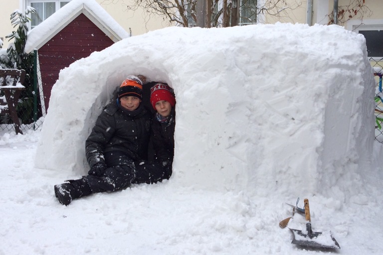 Luis und Tobias haben sich mächtig ins Zeug gelegt und auch Papa hat ein bisschen geholfen – jetzt ist die eisige Bleibe fertig