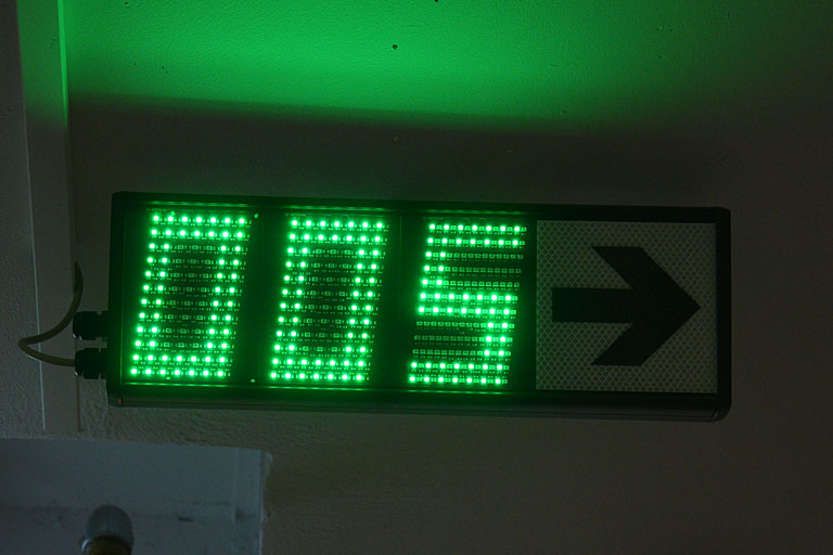 Neu in der Kongressgarage ist auch das Einzelparkplatzerfassungs- und Leitsystem. Es zeigt den Weg zu den noch freien Parkplätzen an. An der Decke in den Fahrstraßen sind Displays angebracht, die die jeweilig noch verfügbaren Parkplätze in den einzelnen Bereichen anzeigen.