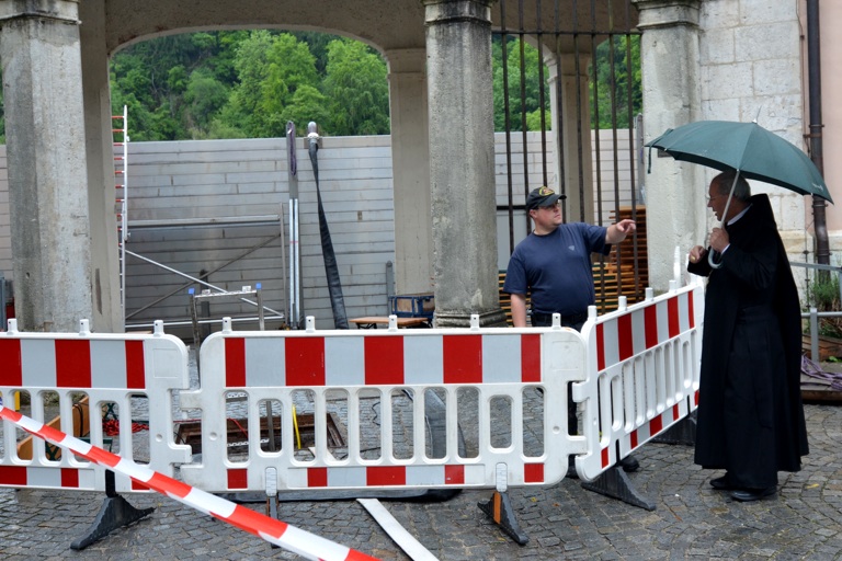Mit Gottes Hilfe: Abt Thomas Freihart informiert sich. Im Hintergrund der neue künstliche Hochwasserschutz für das Kloster Weltenburg.