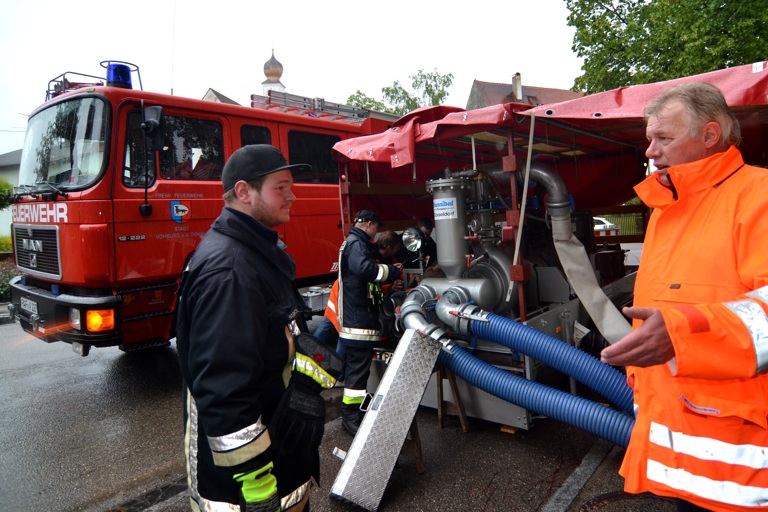 In Vohburg hat Bürgermeister Martin Schmid heute Vormittag neben der Stadtfeuerwehr auch die Wehren aus allen Ortsteilen alarmiert. Rund 30 Männer sind im Einsatz. Mit zwei Hochleistungspumpen „Hannibal“, die jeweils 7000 Liter pro Minute bewältigen, soll die Kanalisation entlastet beziehungsweise der Grundwasserspiegel gesenkt werden, damit die Keller in der Stadt nicht volllaufen, so Schmid im Gespräch mit unserer Zeitung.