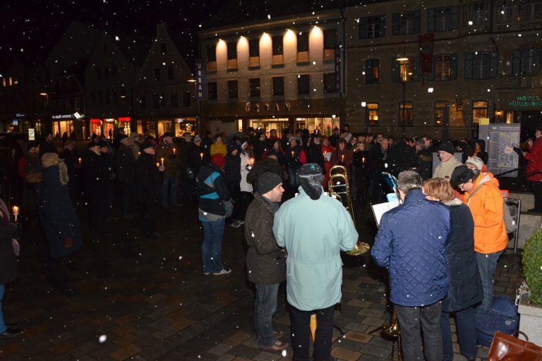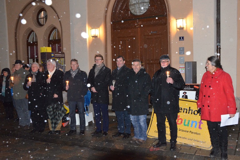 (ty) Vor dem Rathaus hat das Bündnis „Pfaffenhofen gegen Rechts – Bürger für Toleranz“ heute Abend mit einer Kundgebung ein ebenso eindrückliches wie ausdrückliches Zeichen gesetzt – gegen Gewalt und Terror sowie für die Grundrechte. Es wurde ein symbolischer Lichterkreis gebildet und mehrere Personen verlasen Artikel aus dem Grundgesetz, ehe man zusammen für einige Minuten in Stille verharrte. Rund 150 Leute nahmen an der Aktion teil, die musikalisch vom Posaunenchor der evangelischen Kirchengemeinde begleitet wurde.