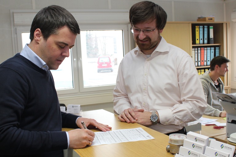 Bürgermeister Thomas Herker (SPD) ist der erste Stromkunde der Stadtwerke. Er unterschrieb den Vertrag noch im alten Kundencenter an der Weiherer Straße.