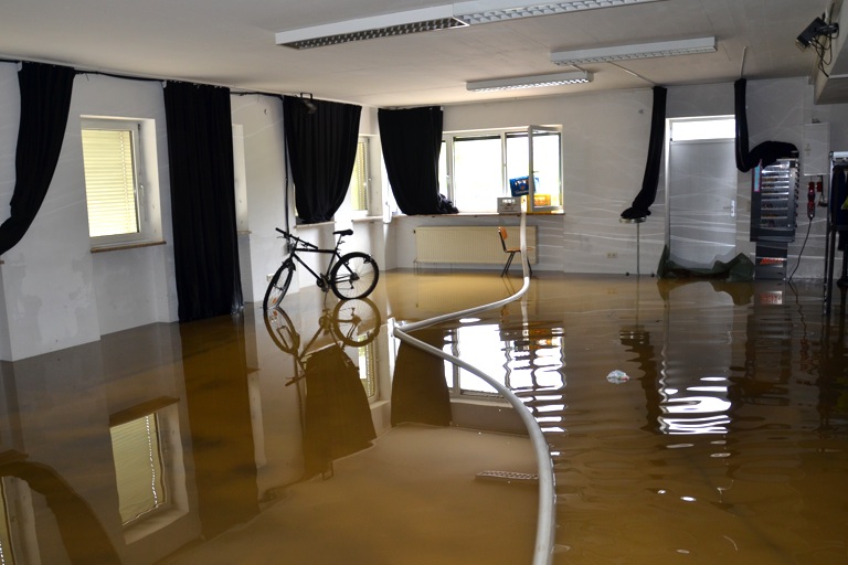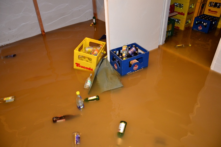 Doch das Wasser brach sich in der Nacht auf heute trotz aller Mühen seine Bahn. An der Raiffeisenstraße gab ein Flutkanal an zwei Stellen nach und setzte mehrere Hallen und Räume unter Wasser. Unter anderem das Intakt-Musikinstitut von Michael Herrmann. Er und seine Frau waren vorgewarnt. 40 Helfer waren ab 22 Uhr zur Stelle, um den Saal, in dem normalerweise Konzerte mit Barbetrieb stattfinden, zu räumen. In einer Nacht- und Nebel-Aktion halfen alle zusammen, um vor allem die teuren Musikinstrumente und die Soundanlage in Sicherheit zu bringen.