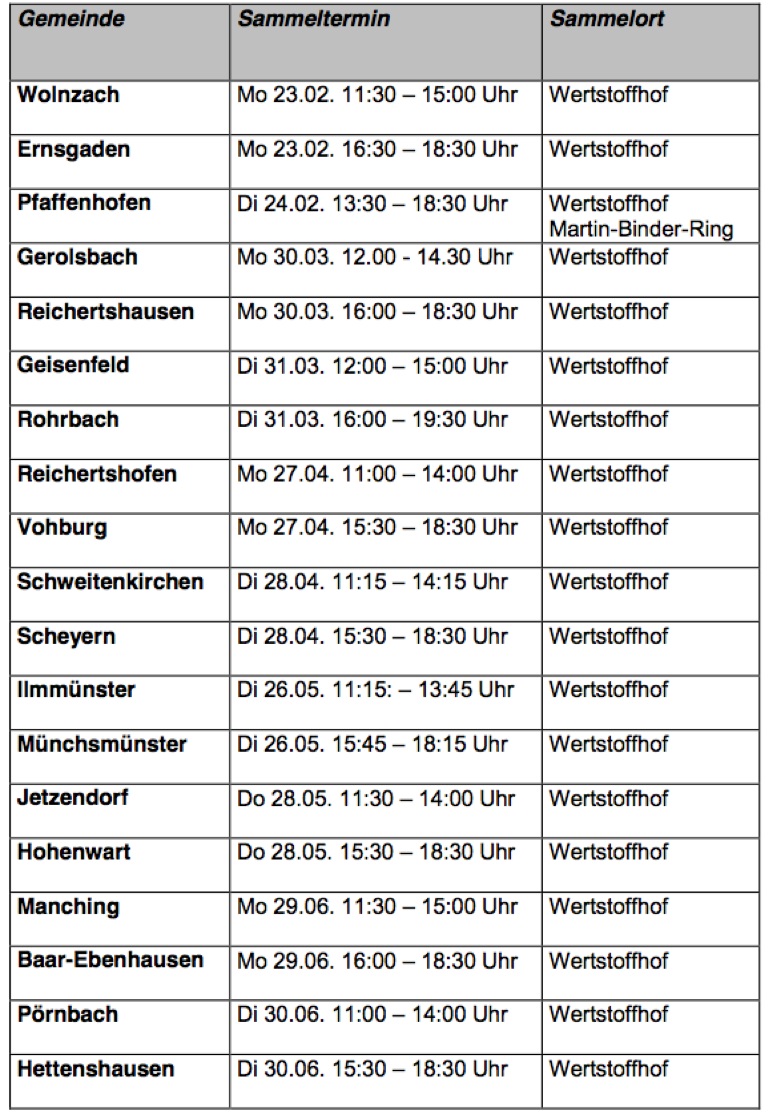 Hier die speziellen Sammeltermine für das erste Halbjahr im Landkreis Pfaffenhofen: