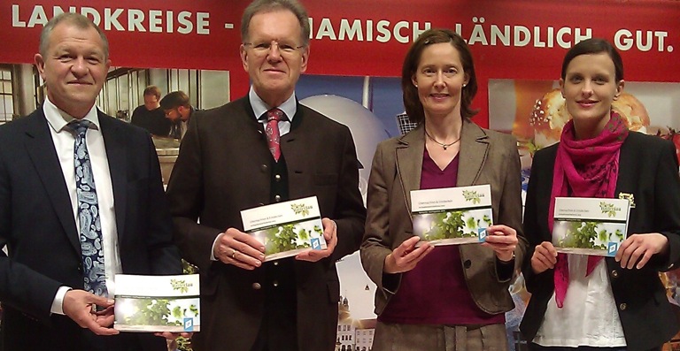 Präsentieren die neue Broschüre „Übernachten & Entdecken im Hopfenland Hallertau 2015“ in Berlin: Robert Winkler (Landkreis Freising, von links), Josef Hauner (Freisinger Landrat), Martina Mayer (Arge Hopfenland Hallertau) und Susanne Schmid (KUS).