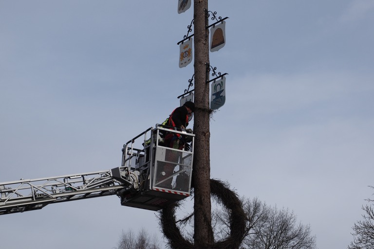 Der Uttenhofener Maibaum vom vergangenen Jahr hat nach rund zehn Monaten ausgedient – und wurde mit Hilfe der Feuerwehr zerlegt
