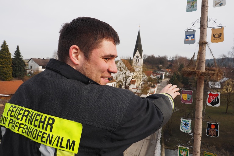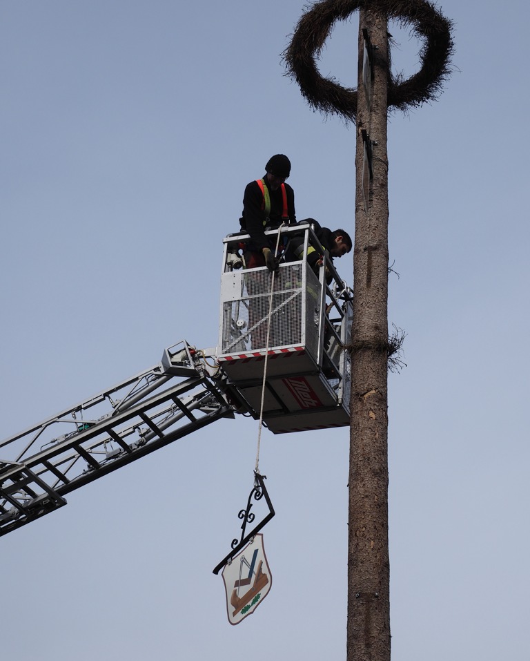 (ind) Fast zehn Monate lang war er der Stolz in Uttenhofens Dorfesmitte, nun wurde er kontrolliert demontiert: Der Maibaum vom vergangenen Jahr hat ausgedient und musste – ziemlich rechtzeitig vor dem nächsten Maifeiertag – weichen. Mit tatkräftiger Unterstützung der Freiwilligen Feuerwehr Pfaffenhofen, die mit dem Fahrzeug „Florian 30/1“ (große Drehleiter) angerückt war, montierten die Helfer des hiesigen Maibaumvereins sorgfältig alle Zunftzeichen ab, bevor der gut 30 Meter hohe Stamm in Einzelstücken zurückgeschnitten und letztlich ausgegraben wurde.