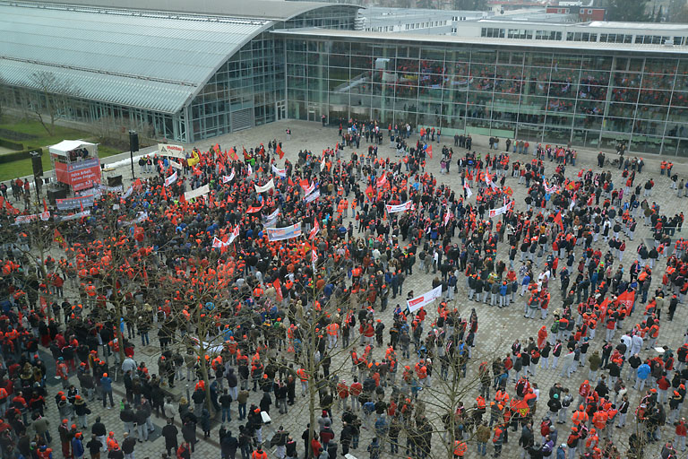 Dass der „Bogen überspannt“ sei, meinte denn auch Jörg Hofmann, der zweite Vorsitzende der IG Metall. Wir wollen und wir werden heute versuche, einen Durchbruch zu erzielen“, sagte er im Hinblick auf die heutige Verhandlungsrunde in Baden-Württemberg, die, sollte es zu einem Abschluss kommen, Pilotcharakter auch für Bayern hat. Auch er bekräftige die Bereitschaft zu Urabstimmung und Streik. Und das soll spätestens Ende dieser Woche geschehen. „Ich finde das Geld in den Lohntüten der Kollegen besser aufgehoben als in den Dividenden für Spekulanten.“