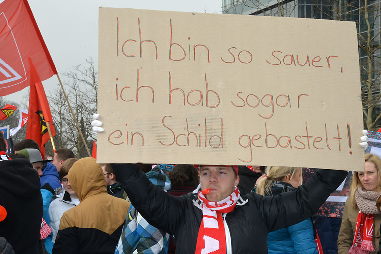„5,5 Prozent mehr Entgelt, das zahlen Deutschlands Wirtschaftsbosse aus der Portokasse. Das ist Spielgeld für die Großen in den Champagneretagen“, so Schlagbauer, „ ich glaube manchmal, das Denken ans Vermögen blockiert bei unseren Arbeitgebervertretern das Denkvermögen. Offensichtlich müssen wir jetzt mit härteren Mitteln klar machen, dass wir es ernst meinen mit unserer Forderung nach mehr Gerechtigkeit. Es ist Dampf auf dem Kessel. Ein ordentliches Angebot muss her, sonst dauert es nicht mehr lange bis zur Explosion.“