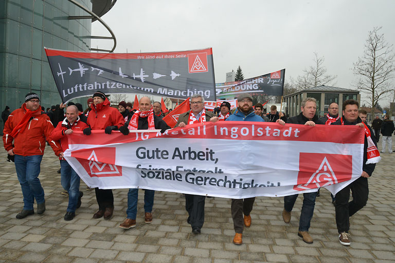 16 000 waren bei in der Tat eisigen Temperaturen selbstredend nicht auf die Audi Piazza gekommen, sondern haben den Warnstreik vermutlich eher im Warmen verbracht. Auch im Gebäude A51 an der Audi Piazza hatten zahlreiche Streikende ein lauschiges Plätzchen gesucht, während draußen auf dem Platz der Erste Bevollmächtigte der IG Metall Ingolstadt, Johann Horn, Jörg Schlagbauer, für die IG Metall-Jugend Daniel Schmid, ein Grußwort halten. Als Hauptredner wird der Zweite Vorsitzende der IG Metall und als Hauptredner Jörg Hofmann Kampfeslust verbreiteten.