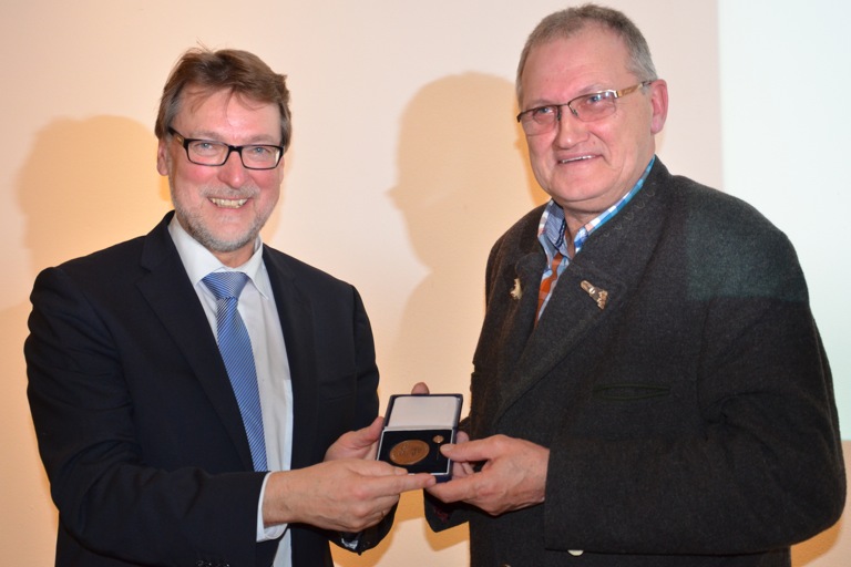 (ty) Eine Auszeichnung für besondere Verdienste in der Kommunalpolitik hat gestern der Hohenwarter Bürgermeister Manfred Russer (CSU, rechts im Bild) erhalten. Landrat Martin Wolf (CSU) verlieh ihm im Namen des bayerischen Innenministers die kommunalen Verdienstmedaille in Bronze. Mit der Medaille, die in Gold, Silber und Bronze verliehen werden kann, werden alljährlich Personen geehrt, „die sich insbesondere durch langjährige Tätigkeit als kommunaler Mandatsträger oder in anderen kommunalen Ehrenämtern um die kommunale Selbstverwaltung verdient gemacht haben“, heißt es aus dem Ministerium. Russer erhielt die Medaille gestern im Rahmen der Kreistagssitzung in Wolnzach, weil er beim offiziellen Verleihungstermin nicht anwesend sein konnte. Russer ist seit über 18 Jahren Bürgermeister von Hohenwart, ebenso lang sitzt er im Kreistag. Seit 2002 ist er außerdem Sprecher der Bürgermeister im Landkreis Pfaffenhofen.