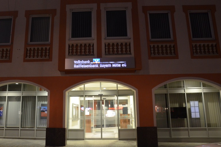 Auch in Pfaffenhofen ist die Volksbank-Raiffeisenbank Bayern-Mitte vertreten; residiert direkt am Hauptplatz.