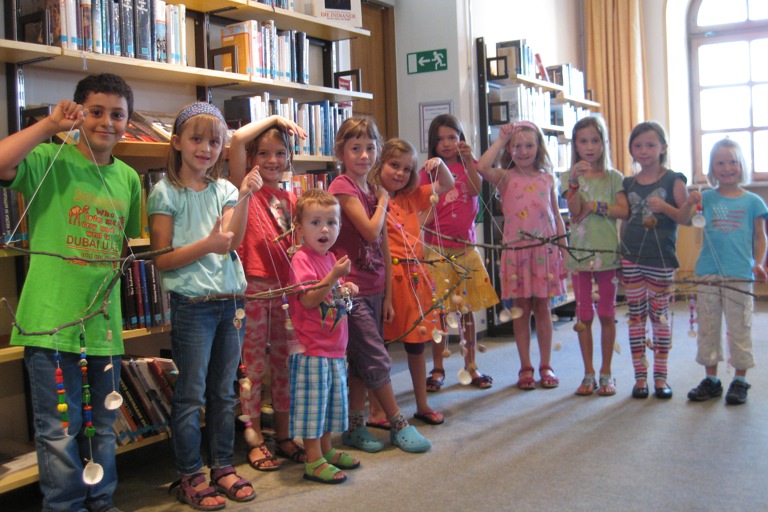 Im Rahmen des Ferienpasses kamen Anfang August Kinder im Alter zwischen sechs und acht Jahren in die Stadtbücherei, um die Abenteuer von Lilli, Flosse und dem Seeungeheuer zu hören. Im Anschluss gestalteten sie ein Muschel-Windspiel.
