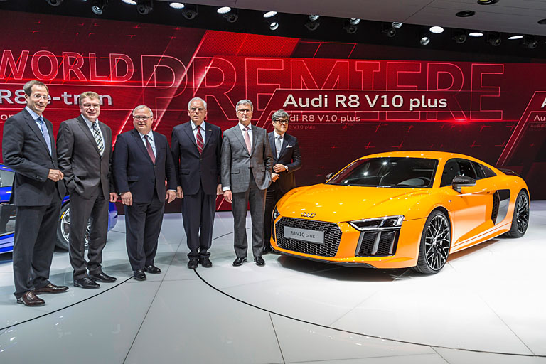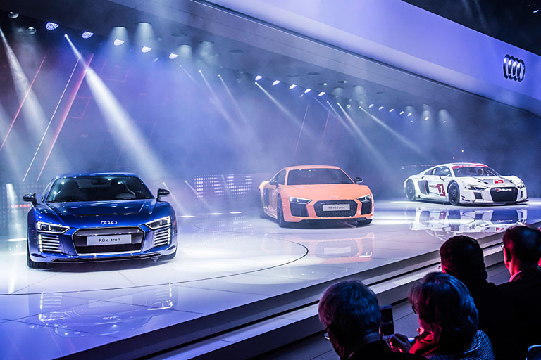 In Genf zeigt Audi seinen Hochleistungssportwagen R8 in der zweiten Generation. Der V10‑Mittelmotor und ein neu entwickelter quattro‑Antrieb sorgen für sportliche Fahrleistungen, vor allem in der Topversion R8 V10 plus mit 449 kW (610 PS): von 0 auf 100 km/h geht es in 3,2 Sekunden, der Topspeed beträgt 330 km/h.