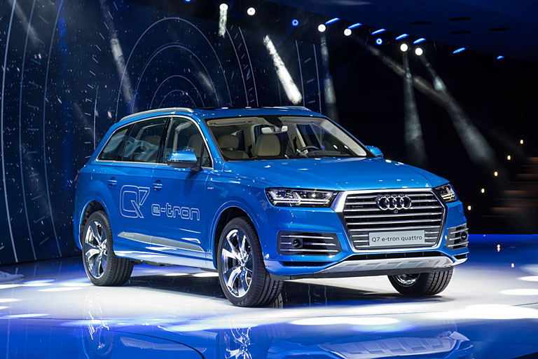 Mit dem Q7 e‑tron quattro stellt Audi sein zweites Modell mit Plug‑in‑Hybridantrieb vor. Der große SUV ist das weltweit erste Plug‑in‑Hybridauto mit einem Sechszylinder-Diesel und permanentem Allradantrieb. Mit Strom aus der Lithium‑Ionen‑Batterie fährt der Q7 e‑tron quattro bis zu 56 Kilometer rein elektrisch. Zusammen mit dem Dieselmotor ergibt sich eine Gesamtreichweite von 1410 Kilometer. Nach der ECE‑Norm für Plug‑in‑Hybridfahrzeuge begnügt er sich auf 100 Kilometer mit 1,7 Liter Diesel – ein CO2‑Ausstoß von weniger als 50 Gramm pro Kilometer und ein neuer Bestwert im Segment.