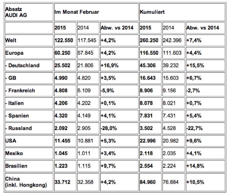 Für Februar stehen 122 550 Auslieferungen zu Buche, das ist ein Plus von 4,2 Prozent – In den USA vermeldet der Ingolstädter Autobauer das 50. Rekord-Monat in Folge