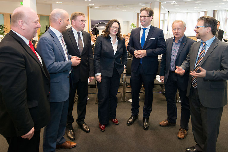 (ty) Vor über hundert geladenen Gästen des Audi Gesamtbetriebsrats hat Andrea Nahles (SPD), Bundesministerin für Arbeit und Soziales, im Audi Konferenzcenter heute Nachmittag über das Thema „Das demokratische Unternehmen – Aufbruch in eine neue Humanisierung der Arbeitswelt“ gesprochen. Zuvor hatte sich Nahles mit Gesamtbetriebsratsvorsitzendem Peter Mosch und mit Jörg Schlagbauer, dem Vorsitzenden der IG-Metall Vertrauenskörperleitung bei Audi, zum Sechs-Augen-Gespräch über arbeits- und sozialpolitische Inhalte getroffen.