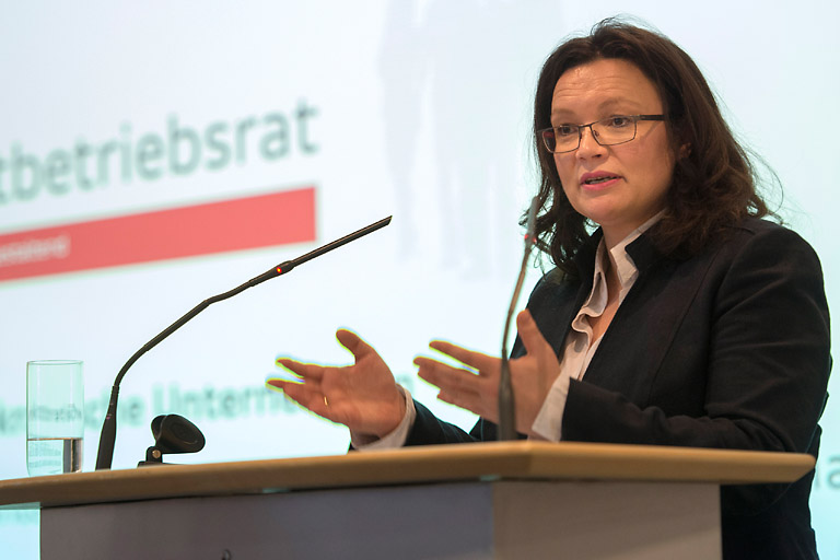 Wie lassen sich Demokratie und Mitbestimmung in Unternehmen gestalten, deren Arbeitsweise zunehmend von Globalisierung und Digitalisierung bestimmt werden? Dieser Frage ging Bundesministerin Andrea Nahles in ihrem Vortrag nach. Ihre Forderung war unmissverständlich: „Wir brauchen einen Ansatz, der den ganzen Menschen in den Mittelpunkt rückt und nicht auf seine Funktion als ,Produktivitätsfaktor‘ reduziert!“, betonte Nahles.