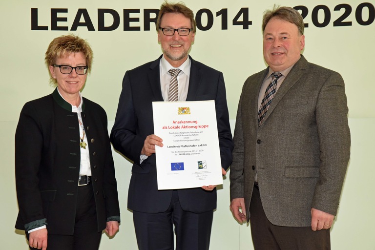 (ty) Jetzt ist es amtlich: Norbert Brunner (CSU), der bayerische Staatsminister für Ernährung, Landwirtschaft und Forsten, hat gestern in München die offiziellen Anerkennungsurkunden an die Vertreter der 61 Regionen übergeben, die in der ersten Auswahlrunde zur Aufnahme in das EU-Förderprogramm „Leader“ erfolgreich zum Zuge gekommen sind. Der Pfaffenhofener Landrat Martin Wolf (CSU) und die hiesige Leader-Koordinatorin Alice Köstler-Hösl nahmen das Dokument stellvertretend für die „Lokale Aktionsgruppe Landkreis Pfaffenhofen“ (LAG) in Empfang.