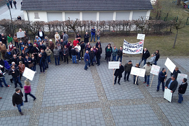 Vor dem Reichershofener Rathaus wandten sich heute Abend bei einer Kundgebung gut 130 Leute gegen die im 830-Einwohner-Ortsteil Winden geplante Gemeinschafts-Unterkunft für 130 Asylbewerber – Der Bauausschuss behandelt ab 18.30 Uhr die vom Eigentümer beantragte Nutzungsänderung