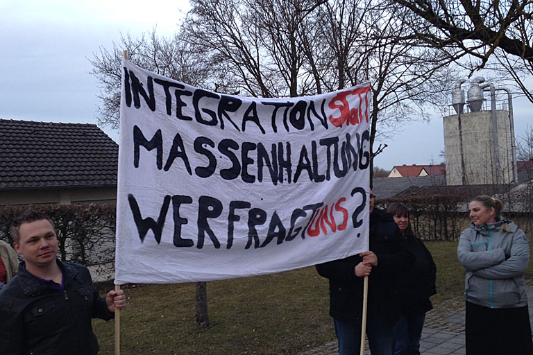"Bürger wehrt euch", stand auf einem der Transparente zu lesen oder "Macht unsere Heimat nicht zum Auffanglager". Und natürlich die zentrale Botschaft: "131 sind zuviel für unseren kleinen Ort." Gefordert wurde auch "Integration statt Massenhaltung".
