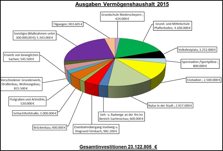 Die so genannte Zuführung vom Verwaltungs- in den Vermögenshaushalt beläuft sich heuer auf satte 7,4 Millionen Euro. Dieser Wert ist deshalb eine so bedeutsame Zahl, weil sie auch immer etwas über die aktuelle Finanzlage einer Kommune aussagt. In diesem Fall heißt das, dass Pfaffenhofen heuer 7,4 Millionen Euro vom "Girokonto" (Verwaltungshaushalt) auf das „Sparbuch“ (also in den Vermögenshaushalt) verschieben kann. Und das ist natürlich sehr erfreulich; denn dieses Geld steht somit für Investitionen zur Verfügung.