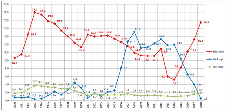 So entwickelten sich (bzw. entwickeln sich laut Plan) Schuldenstand (rot) und Rücklagen (blau); grün die Zinszahlungen und Tilgungen.