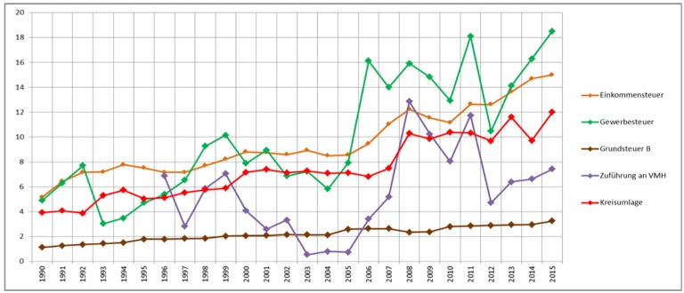 Diese Grafik ist schon eher was für Fortgeschrittene, aber sie fasst wichtige Einnahmen- und Ausgabenposten sowie ihren Entwicklung über die Jahre zusammen: Einkommensteuer (orange), Gewerbesteuer (grün), Grundsteuer B (braun), Kreisumlage (rot) und die Zuführung vom Verwaltungs- in den Vermögenshaushalt (lila).