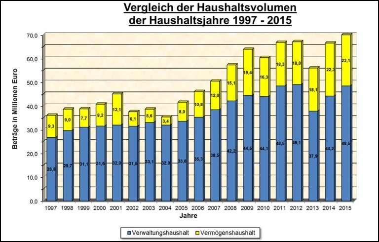So hat sich das Haushalts-Volumen über die Jahre entwickelt: blau der Anteil des Verwaltungs-, gelb der des Vermögenshaushalts am Gesamt-Etat.