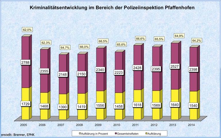 Zehn-Jahres-Vergleich: Entwicklung der Zahl der Straftaten und der Aufklärungsquoten im Zuständigkeitsbereich der Inspektion Pfaffenhofen.