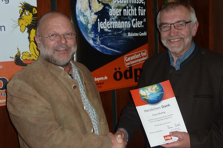 Nach diesem Überblick über die Lage der Partei wurden verdiente Mitglieder geehrt. Eine Urkunde und die goldene Ehrennadel der ÖDP bekamen der ehemalige Stadtrat Franz Muthig, der neun Jahre lang dem Gremium angehörte, sowie der ehemalige Kreisrat Helmut Riedl, der die ÖDP zwei Legislaturperioden vertrat. Für 25-jährige Mitgliedschaft wurden Johanna Bischl und Alexander Langer mit einer Urkunde bedacht.