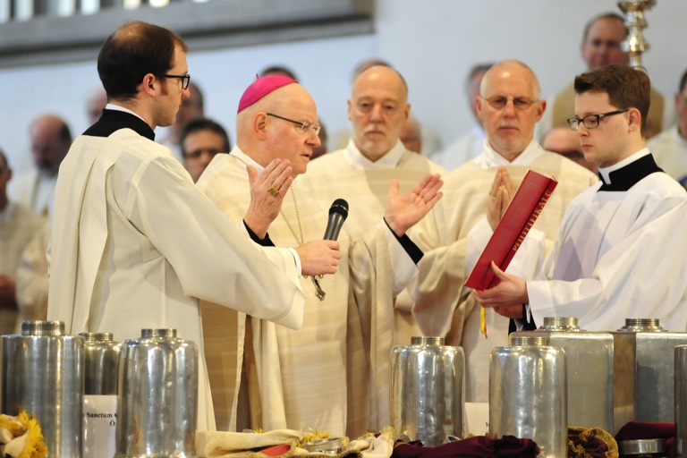 Bischof Zdarsa hat heute mit rund 250 Diakonen und Priestern aus dem Bistum, Weihbischöfen und dem Domkapitel sowie Hunderten Gläubigen im Augsburger Dom die Chrisam-Messe gefeiert